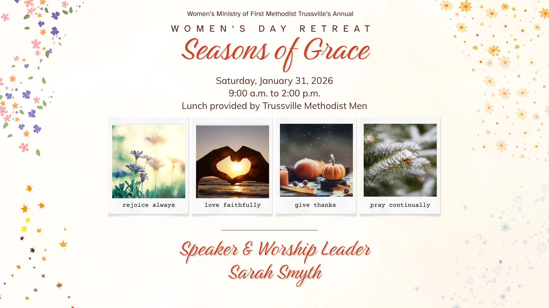 Seasons of Grace is the theme for this year's Women's Ministry Day Retreat. Our speaker and worship leader will be Sarah Smyth. Lunch will be provided by the Trussville Methodist Men.